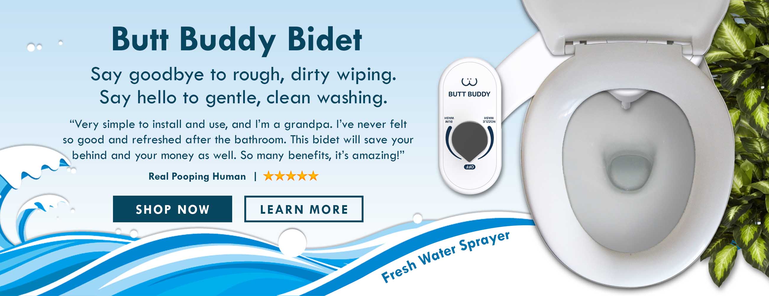 Stop Wiping. Start Washing. Butt Buddy is state-of-the-art, fresh water bidet that easily attaches to your toilet and gently washes your booty after you poop or use the bathroom, transforming...